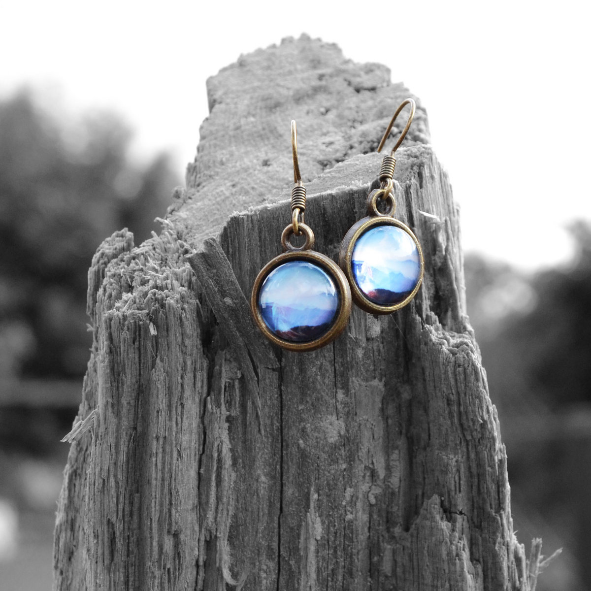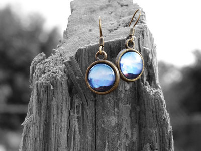 Hand-made earrings with artwork "A Sign" behind glas.