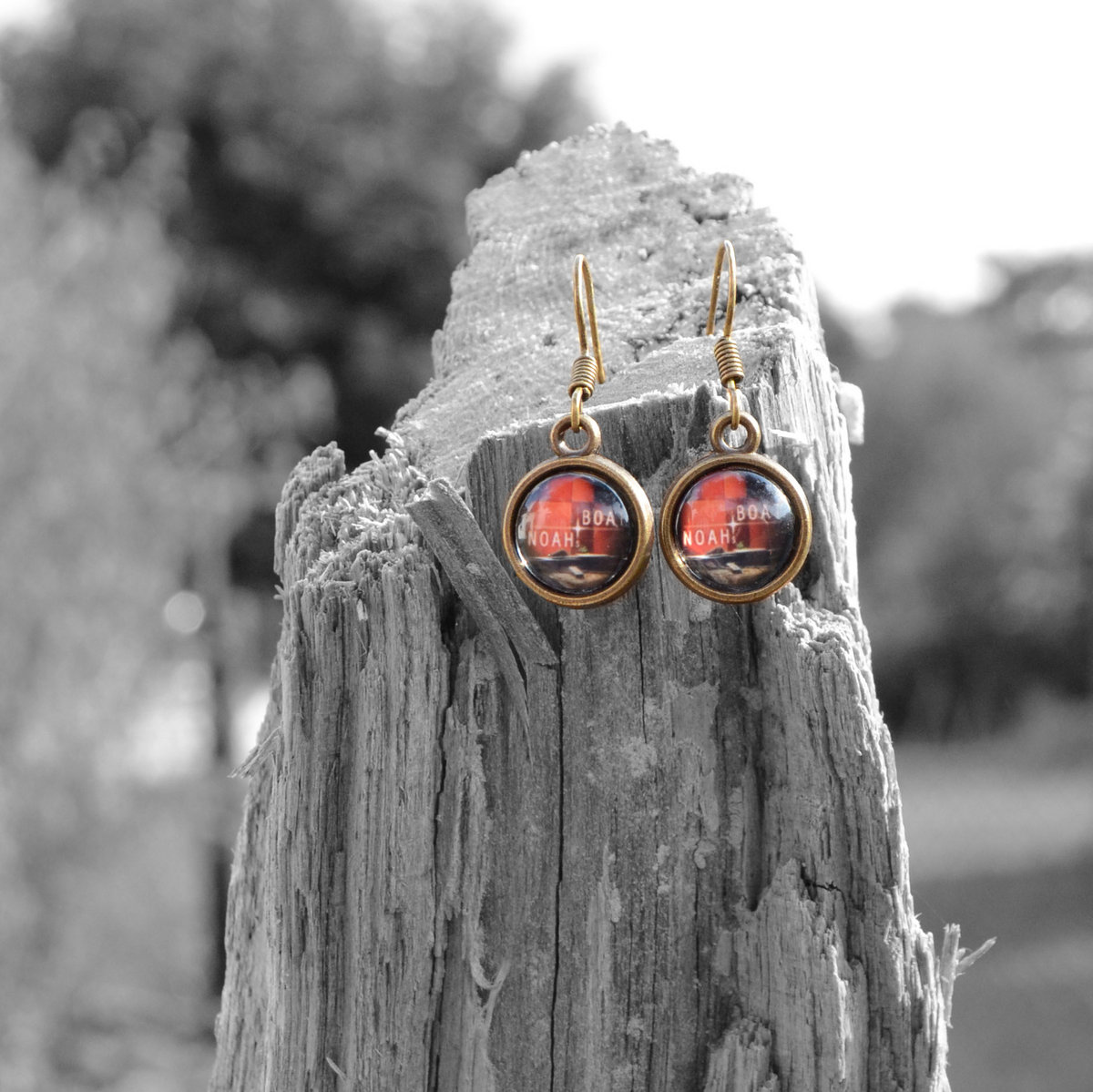 Hand-made earrings with artwork "Noahs Boat" behind glas.
