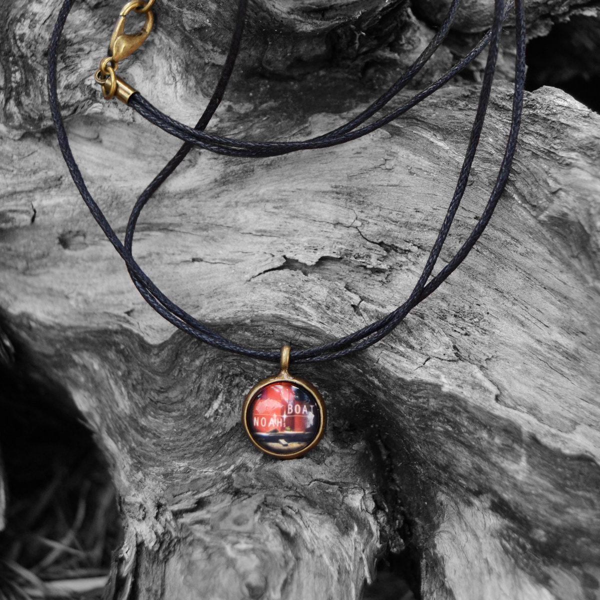 Hand-made necklace with artwork "Noahs Boat" behind glas.