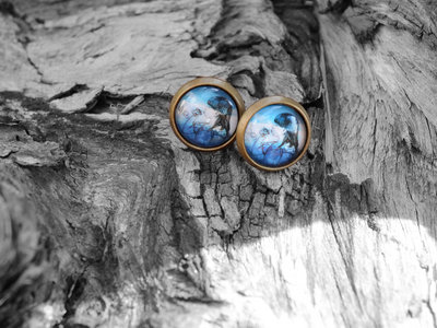 Hand-made stud earrings with artwork "A Sign - Girl" behind glas.